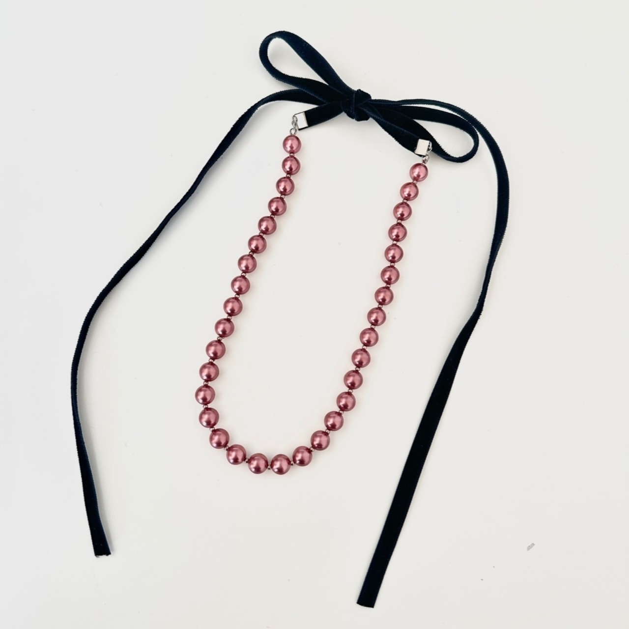 ローズピンクのカラーパールとベロアリボンを使用した、上品でクラシカルな印象のネックレスです。